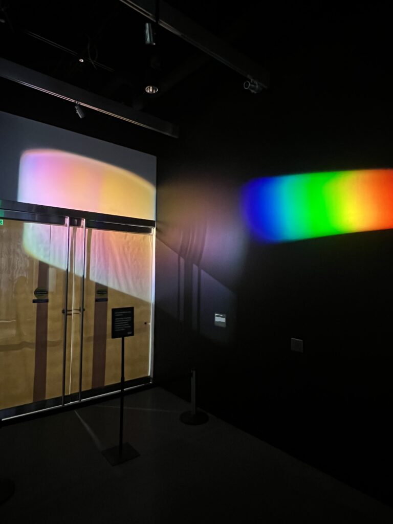 The event closed with the premiere of “RED GREEN BLUE,” a 3D-printed, holographic sculptural artwork by Myers, created in collaboration with Ben Miller (MIT MechE ‘23) and Mueller, and supported by a grant from the Council for the Arts at MIT. The piece consists of three warped solids, 3D-printed and coated in ultrablack materials, each representing a red, green, or blue channel. One side of each object is covered in hand-fabricated holographic film that produces structural color — vivid, angle-dependent hues generated by nanoscale diffraction rather than pigments. As viewers move, the geometries and films reveal subtle parallax and depth, echoing the perceptual illusions of holography while scaling them into programmable, sculptural form.